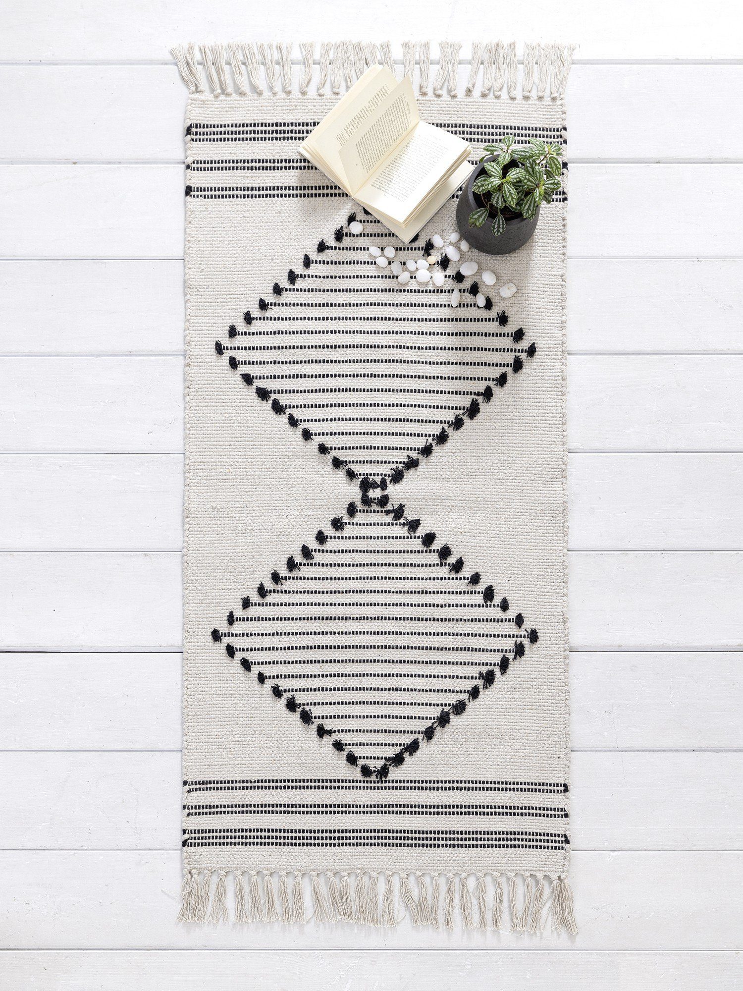 Το βαμβακερό χαλάκι Nomada διακρίνεται για την minimal εμφάνιση και τον μοναδικό του σχεδιασμό. H βάση του είναι σε φυσικό εκρού χρώμα, ενώ ένα λιτό γεωμετρικό μοτίβο που δημιουργείται στην ύφανσή του με μαύρα νήματα, του προσθέτει μοντέρνο και δυναμικό στυλ. Τα διακριτικά κρόσσια στο τελείωμα είναι η πινελιά, που προσθέτει μια παιχνιδιάρικη κίνηση στην συνολική εικόνα. Χάρη στο ουδέτερο χρώμα του μπορεί να συνδυαστεί εύκολα με πολλά διαφορετικά στυλ διακόσμησης, ενώ η minimal αισθητική του δημιουργεί χαλαρή και αρμονική ατμόσφαιρα στον χώρο.