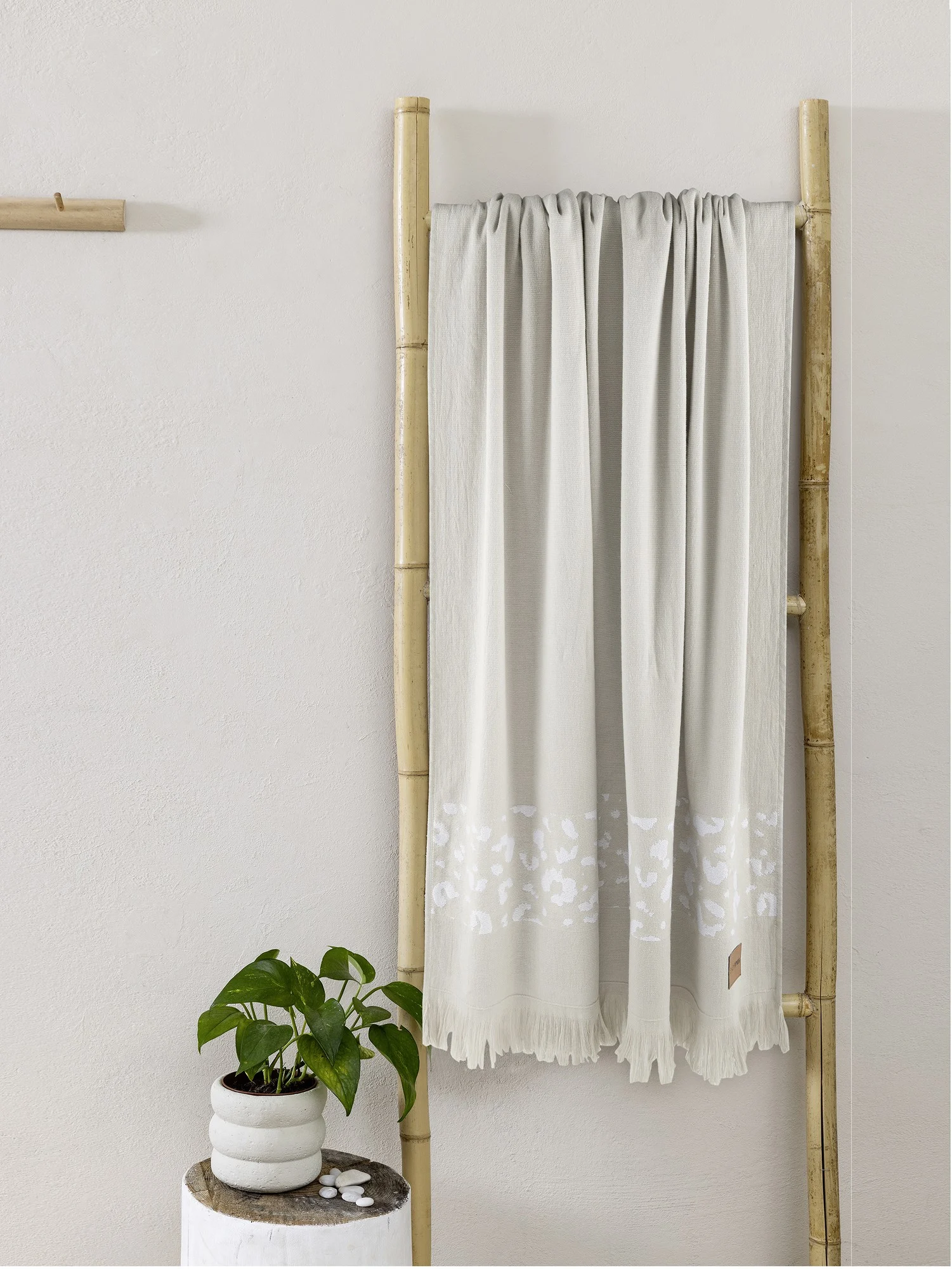 Η βαμβακερή πετσέτα θαλάσσης – πεστεμάλ Lεονα έχει υπέροχη μαλακή υφή και είναι πολύ εύκαμπτη, δίνοντας την δυνατότητα να φορεθεί και σαν παρεό. Η jacquard φάσα στο τελείωμά της διαθέτει ένα κλασικό λεοπάρ μοτίβο, προσδίδοντας μια άγρια και εξωτική αισθητική. Διακριτικά κρόσσια στο φινίρισμά της, δίνουν κίνηση και ταιριάζουν άψογα με την φυσική της υφή και το στιλ της. Είναι μια πετσέτα εξαιρετικά απαλή, με γήινο μπεζ χρώμα, ιδανική για καλοκαιρινές σας αποδράσεις με άνεση και στυλ!