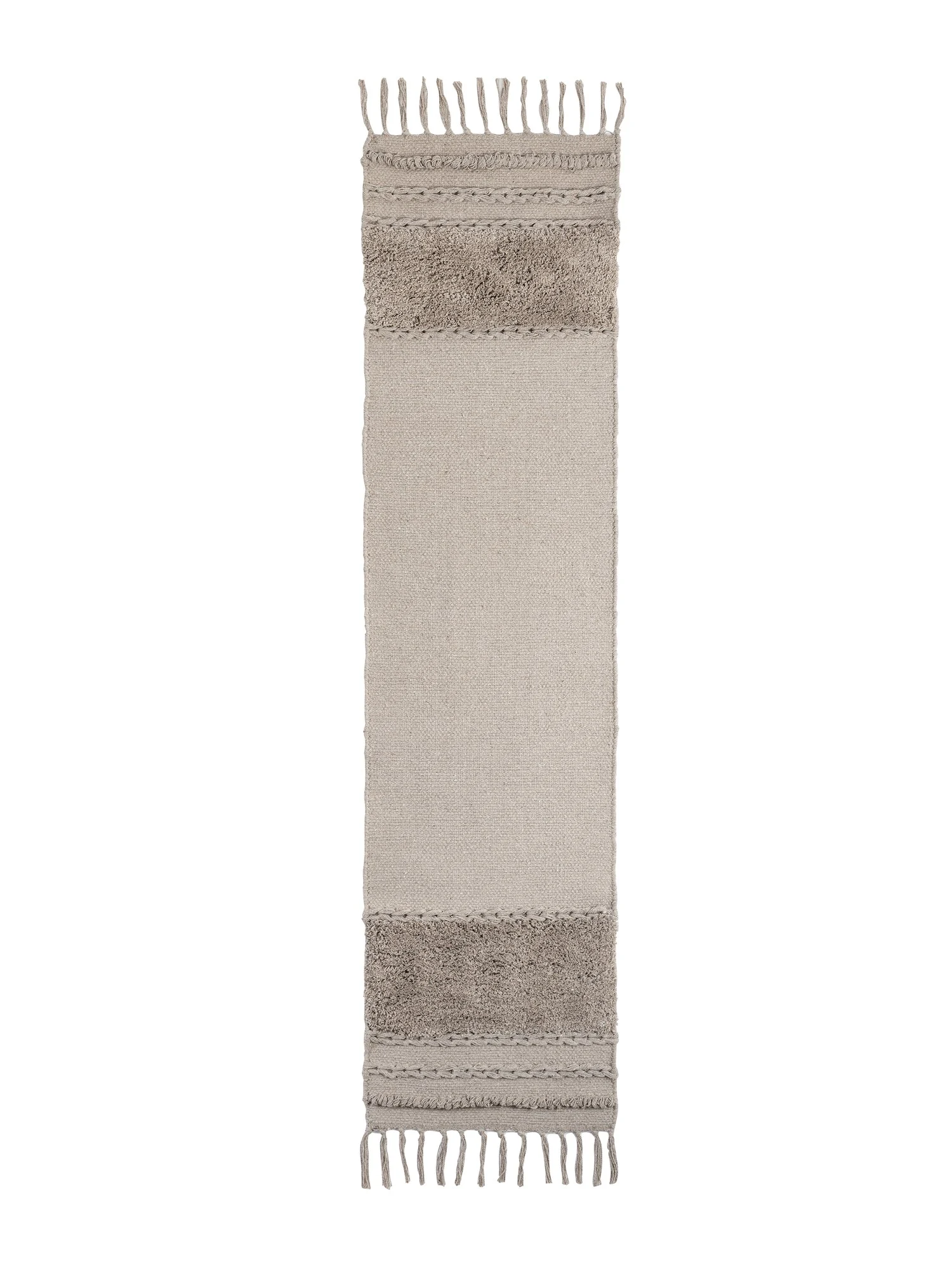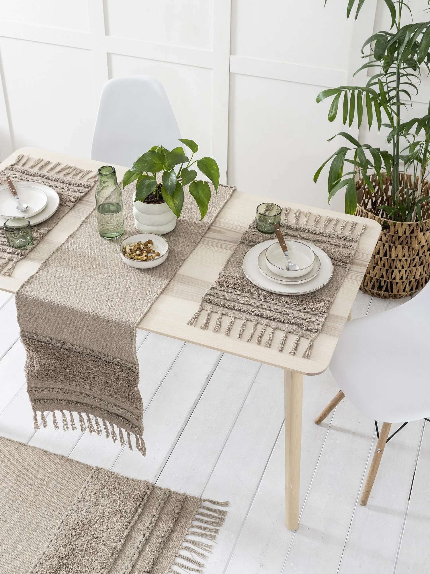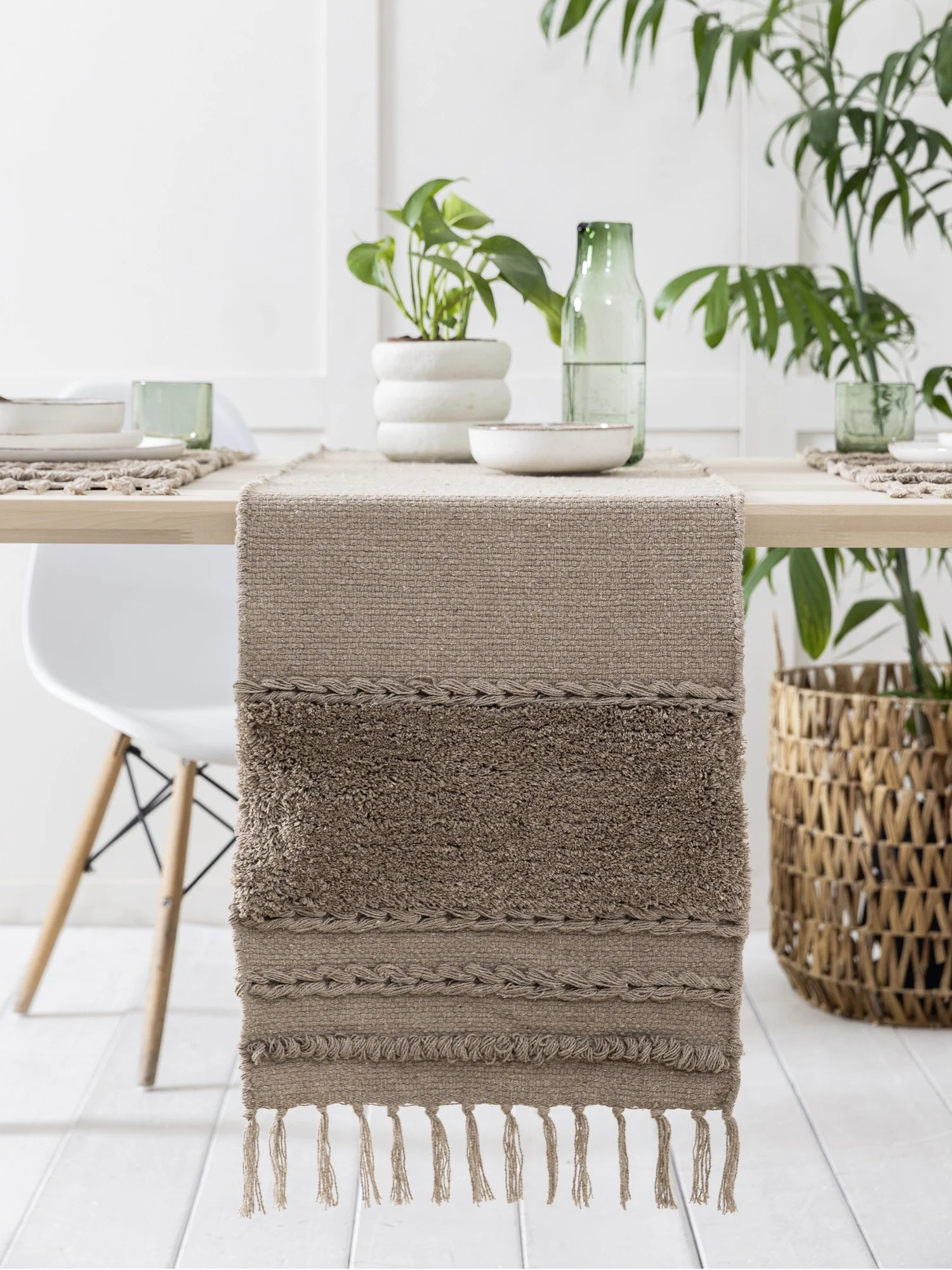 To βαμβακερό runner Loom έχει γήινο μπεζ χρώμα και διακρίνεται για τον minimal και ανάγλυφο σχεδιασμό του. Το σχέδιό του αναπτύσσεται γραμμικά στις δύο στενές του πλευρές και παρουσιάζει ιδιαίτερο ενδιαφέρον καθώς είναι ανάγλυφο και έχει διαφορετικές υφές ανά μοτίβο. Τελειώνει με διακριτικά κρόσσια, που προσθέτουν κίνηση και συμπληρώνουν μια boho εικόνα. Είναι ένα runner που θα ξεχωρίσει για τον χαρακτήρα που θα φέρει στο τραπέζι σας. Χάρη στο ουδέτερο χρώμα του μπορεί να συνδυαστεί εύκολα με πολλά διαφορετικά στυλ διακόσμησης.