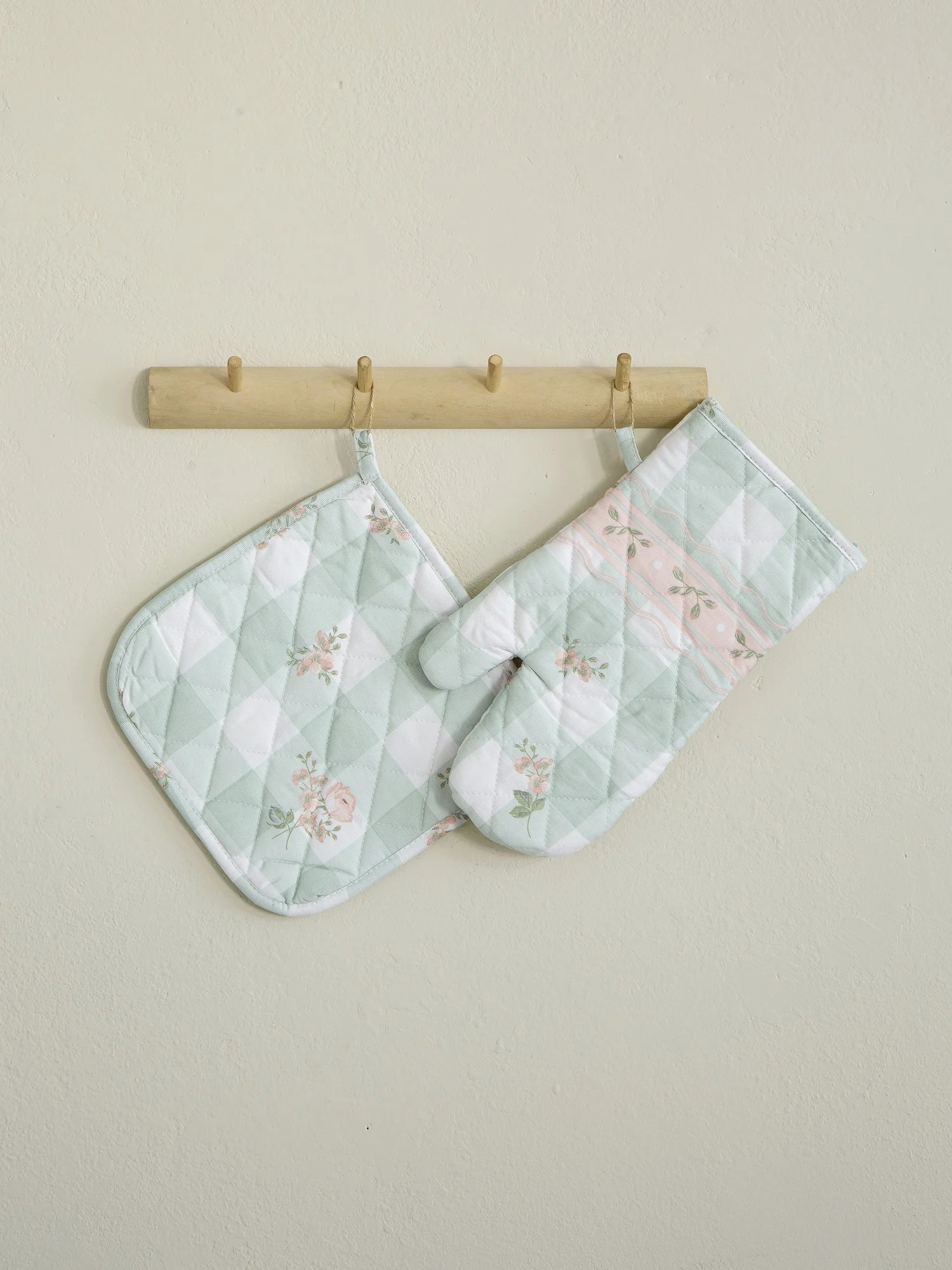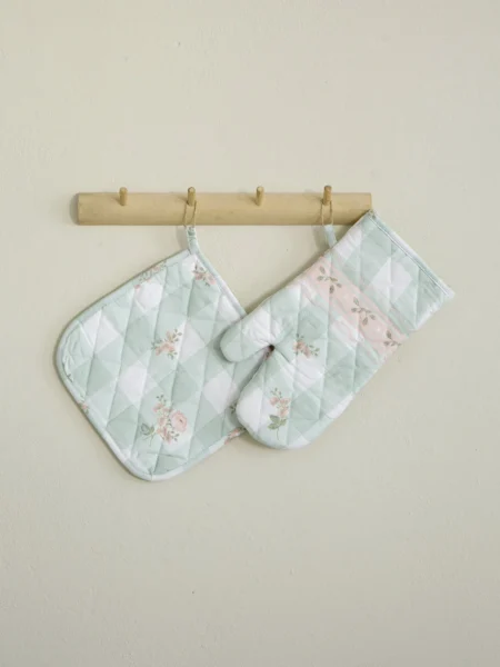 Το σετ κουζίνας Iris που περιλαμβάνει γάντι και πιάστρα, συνδυάζει τις ανοιξιάτικες αποχρώσεις της μέντας με το ροζ σε ένα όμορφο καρώ σχέδιο στολισμένο με διάσπαρτα ανοιξιάτικα λουλούδια. Ένα σέτ κουζίνας ιδανικό για όσους θέλουν να φέρουν ανοιξιάτικο αέρα στην κουζίνα. Συνδυάστε το με ασορτί ποδιά ή τραπεζομάντηλο για ένα ολοκληρωμένο look.