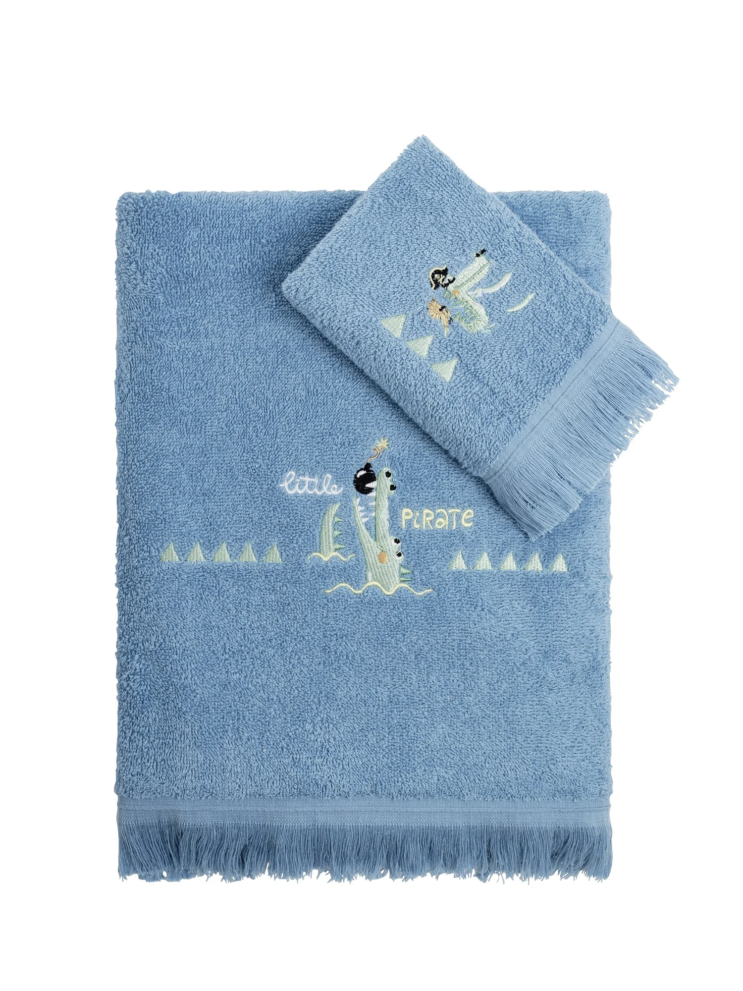 Το βαμβακερό σετ πετσέτες Little Pirate διαθέτει εντυπωσιακά κεντητά μοτίβα με κροκόδειλους πειρατές και την επιγραφή “Little Pirate”, που προσδίδει μια αίσθηση πειρατικής περιπέτειας και διασκέδασης. Το μπλε χρώμα, που παραπέμπει στη θάλασσα, δημιουργώντας ένα χαρούμενο και καλοκαιρινό αποτέλεσμα. Το τελείωμα των πετσετών είναι με διακριτικά κρόσσια που δίνουν μια έξτρα παιχνιδιάρικη νότα. Οι πετσέτες Little Pirate έχουν εξαιρετική απορροφητικότητα, στεγνώνοντας γρήγορα το δέρμα των παιδιών, και πολύ μαλακή υφή που θα κάνει τα παιδιά σας να τις λατρέψουν. Ιδανικό για δωράκι καθώς προσφέρεται σε σετ δύο τεμαχίων σε κουτί.