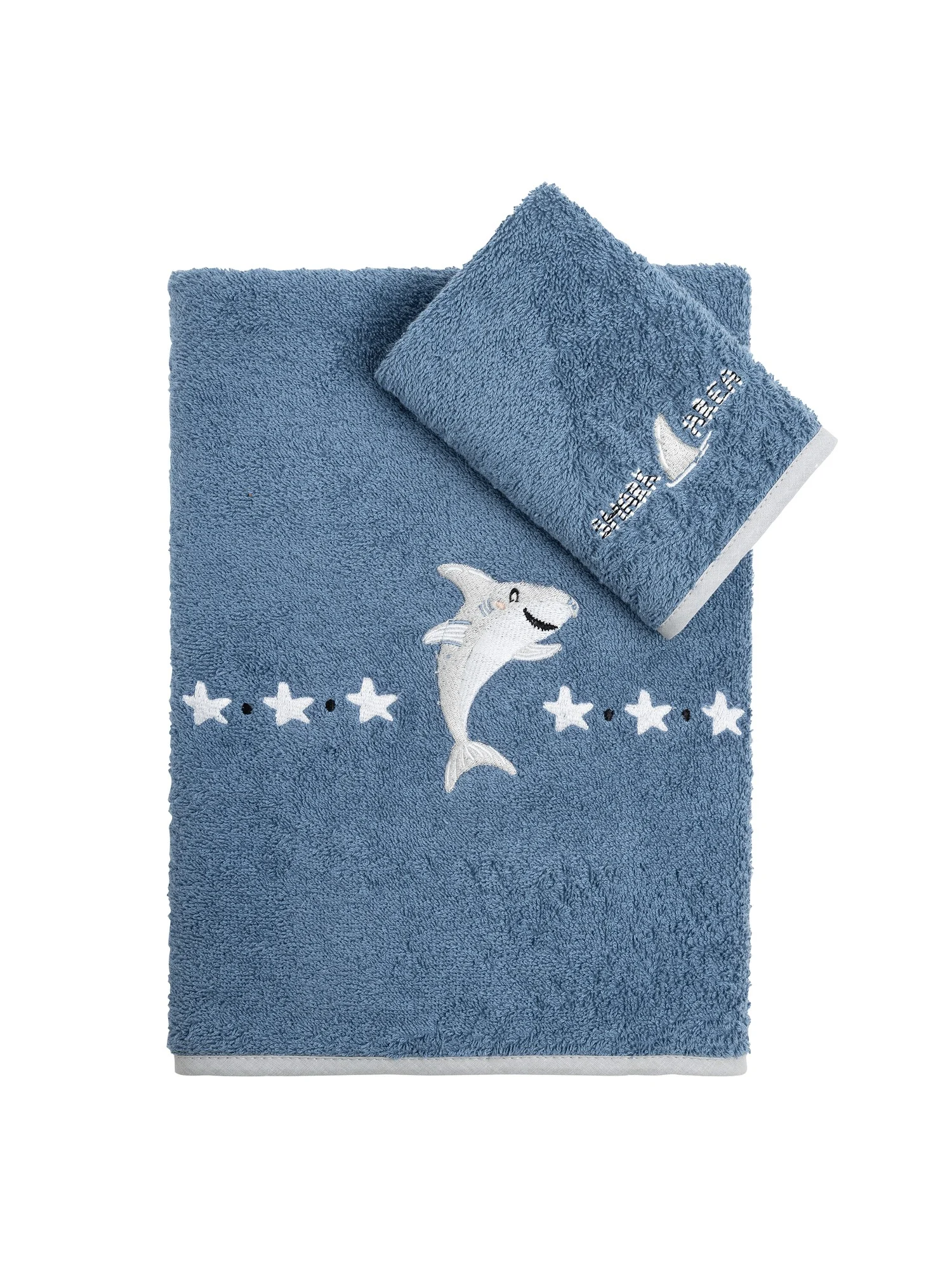 Το βαμβακερό σετ πετσέτες Shark Area διαθέτει ένα εντυπωσιακό κεντητό σχέδιο με έναν χαμογελαστό καρχαρία, αστερίες και την επιγραφή “Shark Area”, που προσδίδει μια αίσθηση υποβρύχιας περιπέτειας και διασκέδασης. Διατίθεται σε βαθύ μπλε χρώμα, που παραπέμπει στον ωκεανό, και εναρμονίζεται άψογα με το θέμα. Το σετ πετσέτες “Shark Area” έχει εξαιρετική απορροφητικότητα, στεγνώνοντας γρήγορα το δέρμα των παιδιών, και πολύ μαλακή υφή που θα κάνει τα παιδιά σας να το λατρέψουν. Ιδανικό για δωράκι καθώς προσφέρεται σε σετ δύο τεμαχίων σε κουτί.