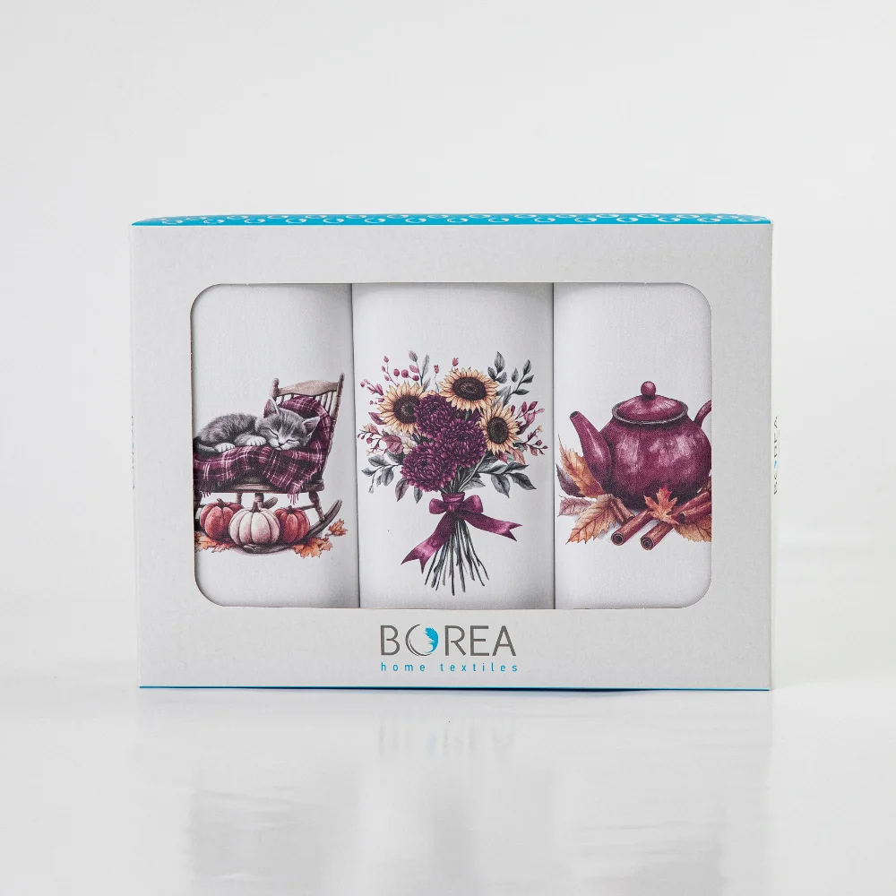Σετ από 3 ποτηρόπανα κουζίνας polycotton, 50% βαμβακερό-50% πολυέστερ, λευκό με ψηφιακή εκτύπωση σε κουτί συσκευασίας δώρου. Για σκούπισμα των πιάτων χωρίς χνούδι.