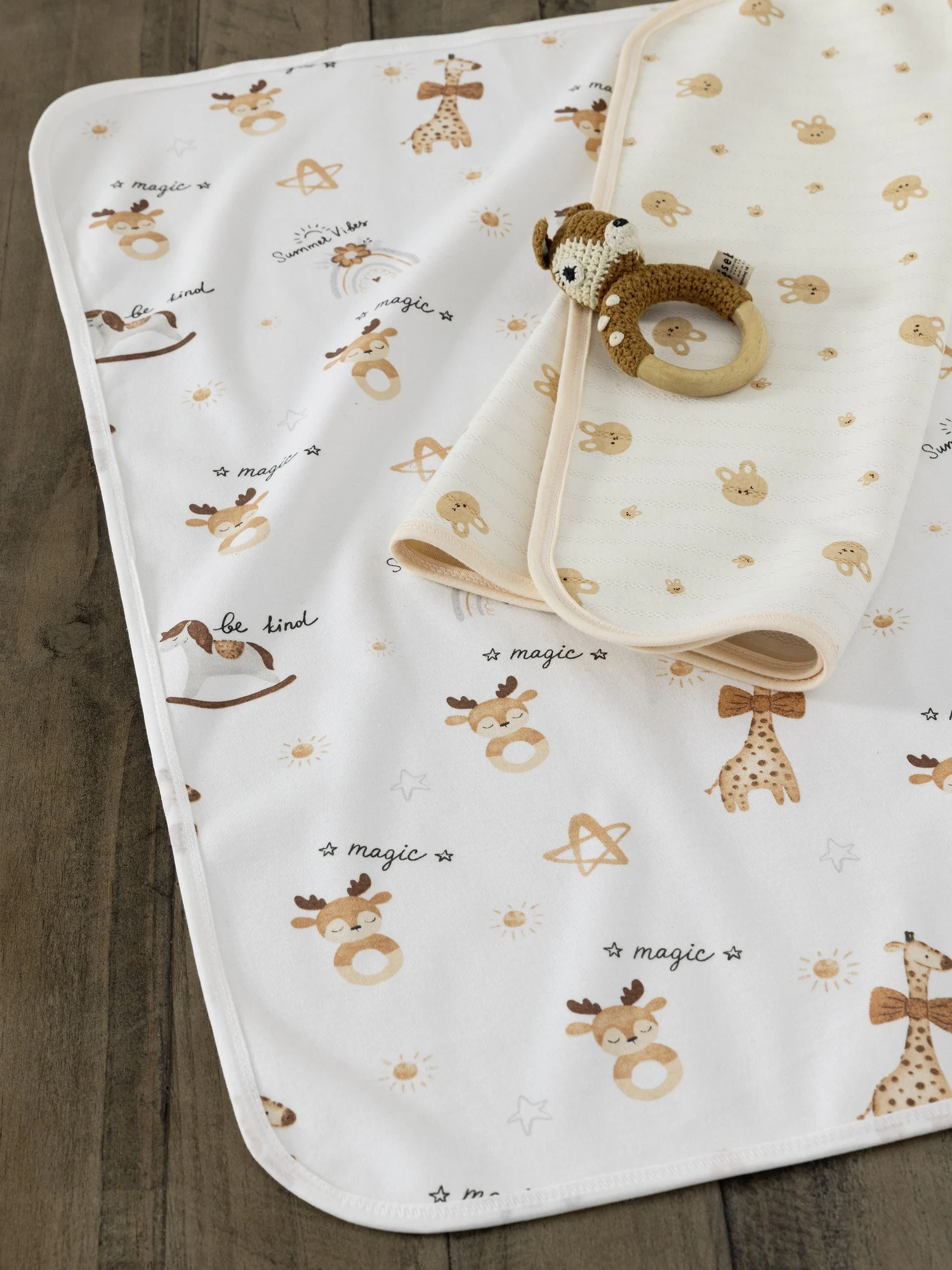 Tο σετ με βαμβακερα αδιάβροχα σελτεδάκια Magic περιλαμβάνει δύο σελτεδάκια με διαφορετικά μοτίβα με χαριτωμένα ζωάκια σε γήινα απαλά χρώματα, όπως λευκό, μπεζ και καφέ, δημιουργώντας ένα γλυκό και ζεστό αποτέλεσμα. Η μαλακή τους υφή προσφέρει μια αίσθηση απαλότητας και άνεσης στο μωρό. Έχουν πρακτικό μέγεθος 55×75 εκατοστά, που είναι ιδανικό για το καρότσι, την κούνια ή την αλλαξιέρα. Tο σετ με τα αδιάβροχα σελτεδάκια Magic, είναι απαραίτητο τόσο στο σπίτι όσο και σε επισκέψεις ή και ταξίδια και ιδανικό για ένα όμορφο πρακτικό δωράκι σε νεογέννητα.