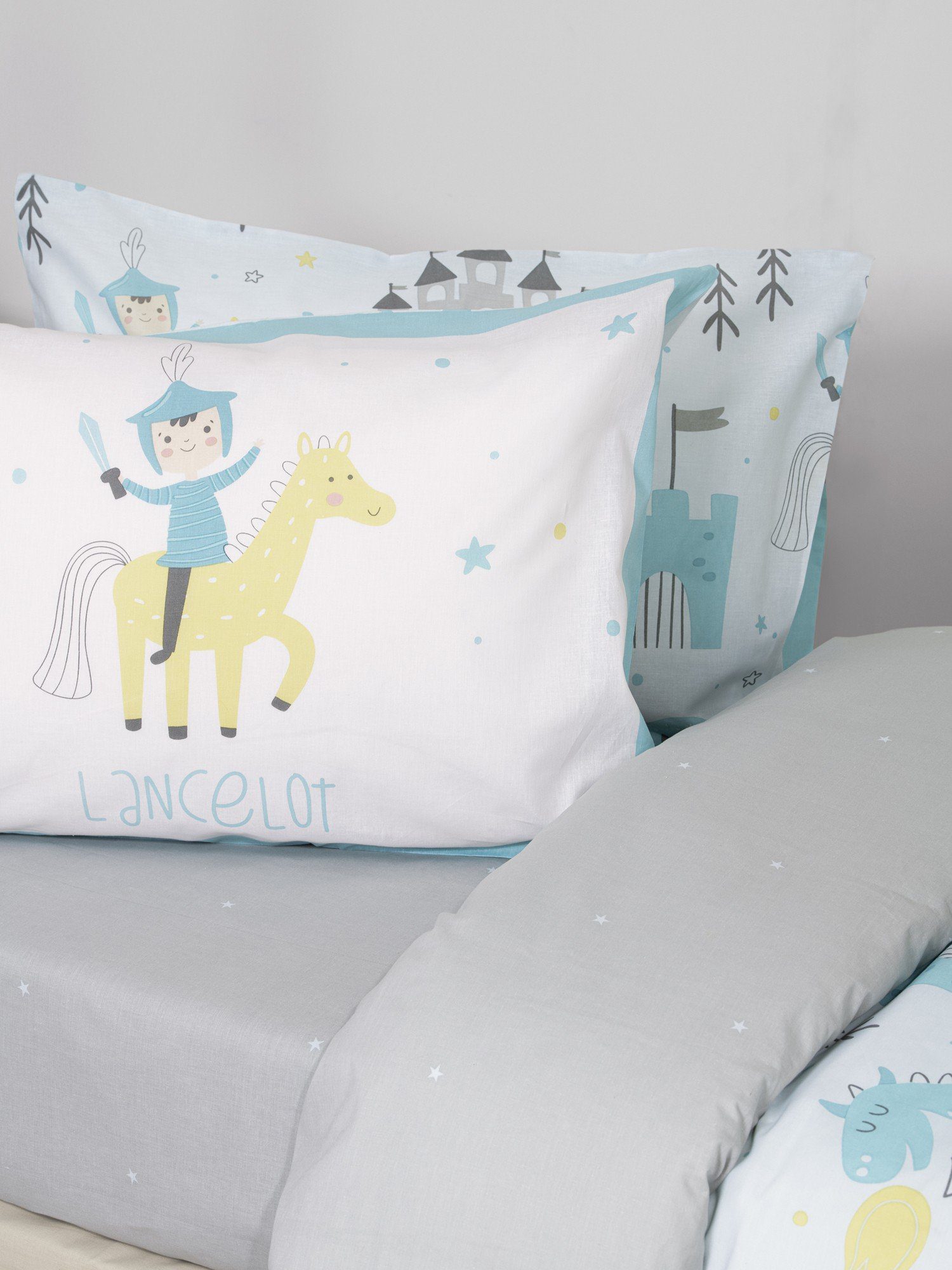 Τo βαμβακερό σετ σεντονιών Lancelot θα μεταμορφώσει το παιδικό δωμάτιο σε ένα μαγικό βασίλειο, γεμάτο με ιππότες, δράκους και κάστρα, όλα σχεδιασμένα με λιτές ανεπιτήδευτες γραμμές, σαν μια παιδική ζωγραφιά. Το κατωσέντονο έχει ένα μονόχρωμο ανοιχτό γκρι φόντο με λευκούς αστερισμούς, προσφέροντας μια ηρεμία στο σετ. Η μαξιλαροθήκη του σετ έχει πάνελ μοτίβο στην μία της όψη και παρουσιάζει ένα κεντρικό σχέδιο ενός ιππότη με την επιγραφή “LANCELOT” πλαισιωμένο με γαλάζια φάσα, ενώ η δεύτερη όψη της έχει το επαναλαμβανόμενο μοτίβο του πανωσέντονου, δίνοντάς σας επιλογές στο στρώσιμο. Η χρωματική παλέτα του σετ είναι φωτεινή και ευχάριστη. Το βασικό φόντο είναι ένα απαλό γαλάζιο, ενώ οι φιγούρες έχουν κίτρινο, τιρκουάζ, γκρι και πράσινο χρώμα, δημιουργώντας μια χαρούμενη και ισορροπημένη αισθητική. Ο σχεδιασμός του σετ είναι ζωντανός και γεμάτος φαντασία, κάνοντας την ώρα του ύπνου μια συναρπαστική ιστορία.